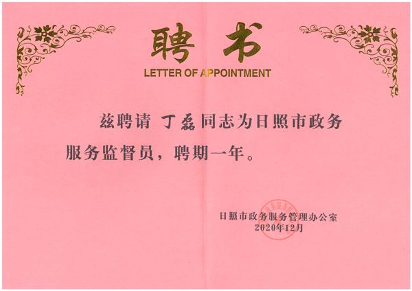 2020年12月3日,日照市政府服務管理辦公室、日照市行政審批服務局舉行日照市政務服務監督員聘任儀式及政府開放日活動,公司董事、行政總監丁磊被聘為日照市政務服務監督員。